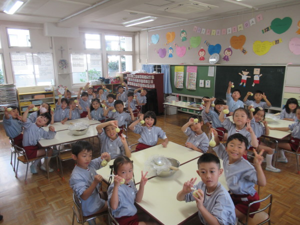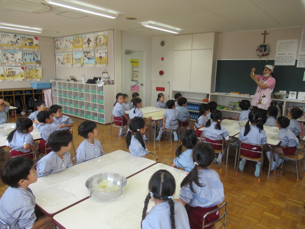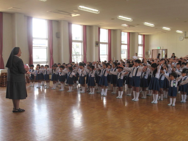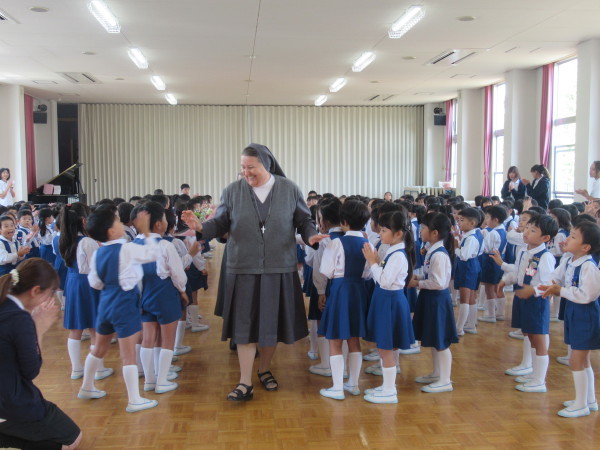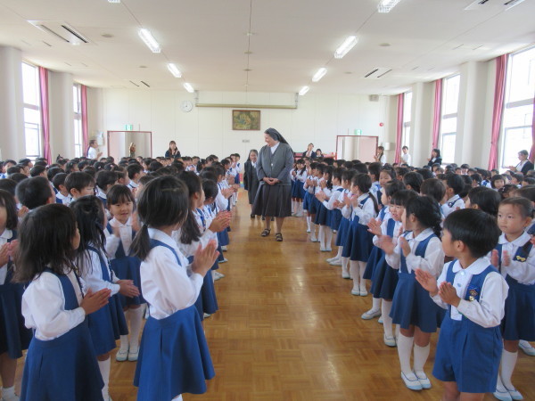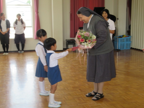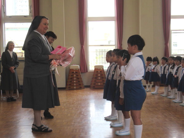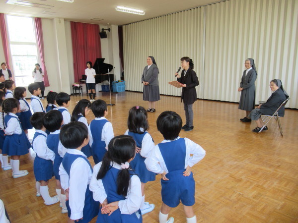 「世界中には、みんなのように幼稚園や学校でお勉強をすることが出来ない子どもたちがいます。そんな世界中の子どもたちのために、お祈りをささげ、お勉強をすることがができるようにしたいと思います。幼稚園のみんなは、とても元気で、お話をしっかりと聞くことが出来ることを知っています。これからも、自分の出来ることをして、頑張ってくださいね。シスターも頑張ります!」