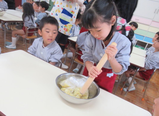 みんなで協力しながら、サツマイモをめん棒を使って潰していきます!!