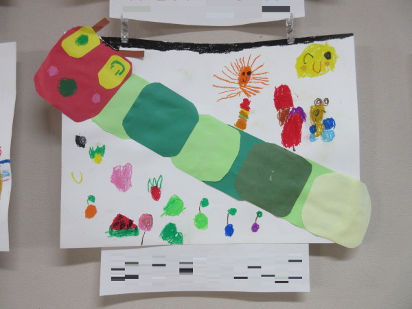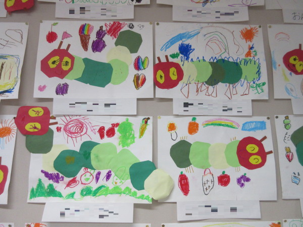 ご飯を食べているところや遊んでいるところなど、周りにもクレパスでたくさん描き足し、かわいいあおむし達の出来上がりです☆★