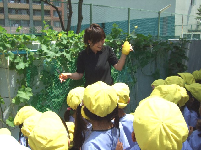 5月に年長のみんなで植えたメロンの苗が、太陽の光をたくさん浴びて、黄色い花が咲き、立派な実をつけました。そして今日収穫することができました!!