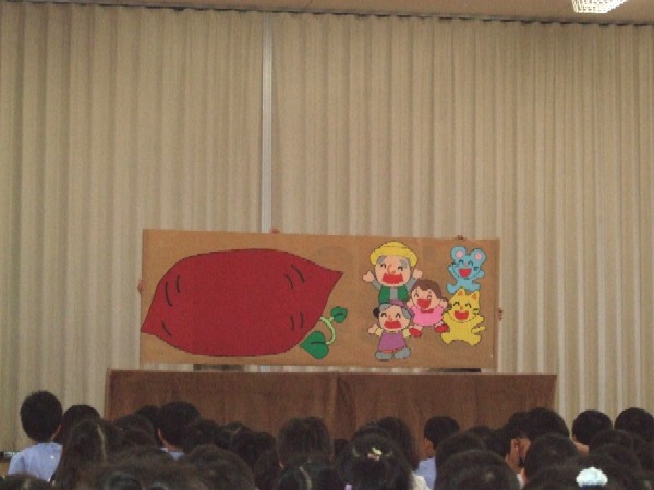 保育者からの出し物『おおきなおいも』では、「うんとこしょ どっこいしょ」と一緒に口ずさみ、おいもが抜けた時には「うわぁ〜!」と歓声も聞こえてくるほどでした!!