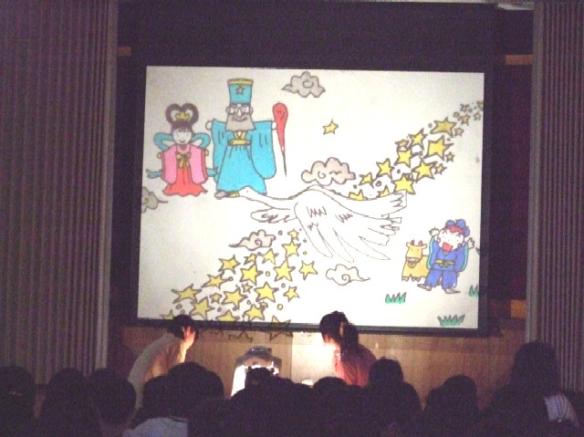 七月ということで先生たちからのプレゼントは「たなばたさま」のお話。スクリーンに映る織り姫と彦星をじっと見入っていた子ども達。クラスの七夕飾りもお空のふたりに届きますように・・・。