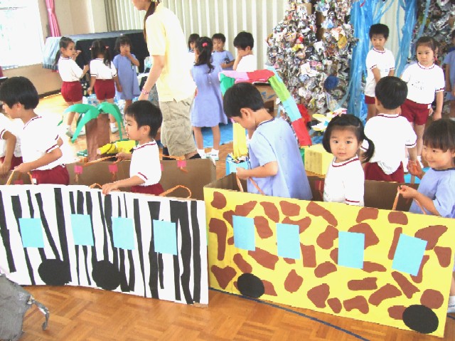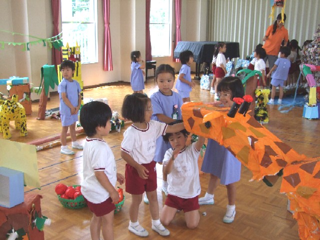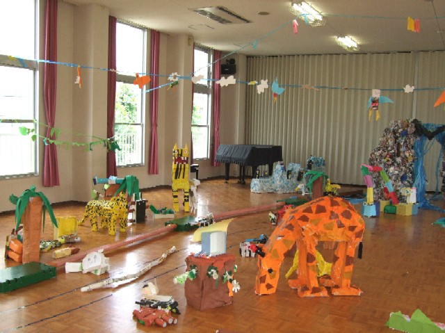 誕生会が終わるとみんなでセッティングし、足りない物を作ったり、壊れたところを修理したりと大忙し。他のクラスが作った動物や大きな滝をみてびっくり!わくわくしながら準備をすすめていきました。