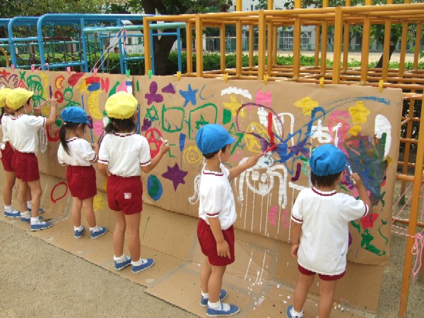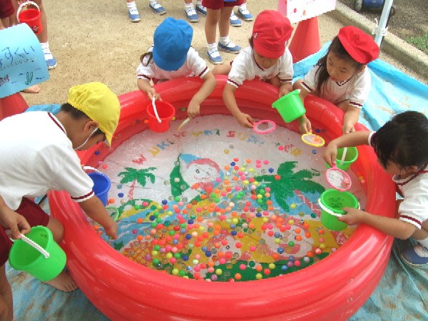 園庭では、スーパーボールすくい、金魚すくい、色水遊び、巨大画、泥んこ遊びをしました!!スーパーボールすくいでは、破れる紙にも負けず、何度も挑戦している姿がとても印象的でした!!