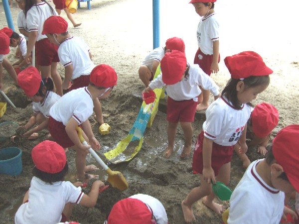 園庭では、ペットボトルに水を入れ、ふたに穴を開け、水をプシュ〜☆砂に絵を描いたり、足に水をかけたりして楽しんでいました!!
