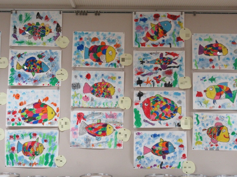 黒色のクレパスで魚を描き、うろこを絵の具で綺麗に塗り分けました♪