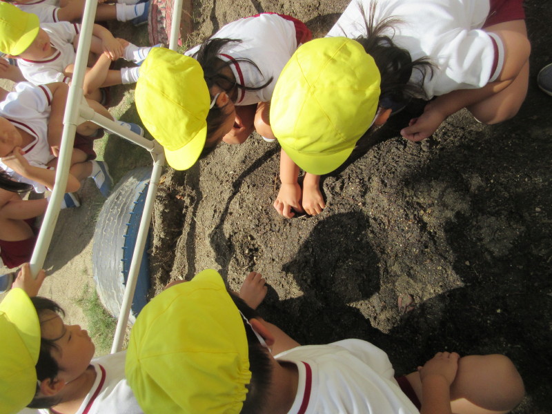 今日は、幼稚園でお芋堀!なんと、ひよこ・ヘビ・ゾウさんがお芋堀のお手伝いに来てくれました(^−^)/