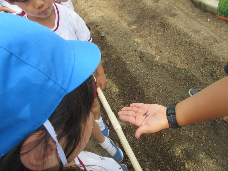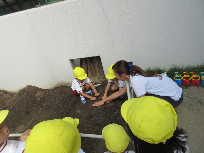 みんなが見守る中、種を植えた後は優しく土を被せました☆