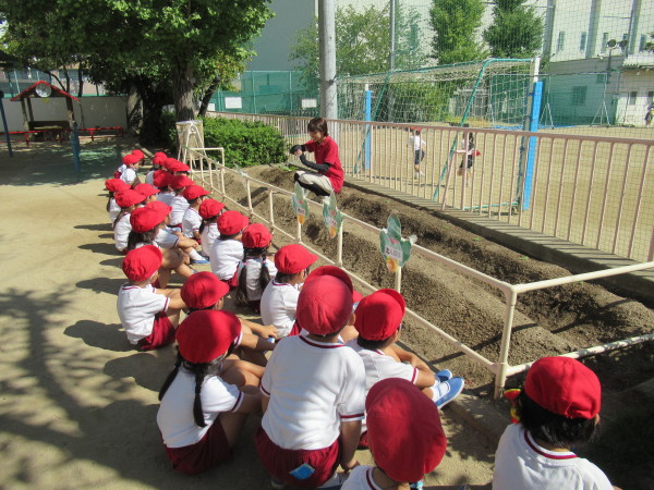 今日は、年中組で「はつか大根」と「さやえんどう」を植えました。