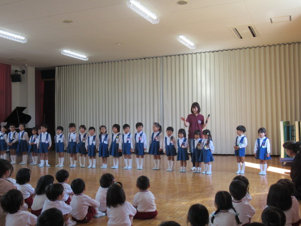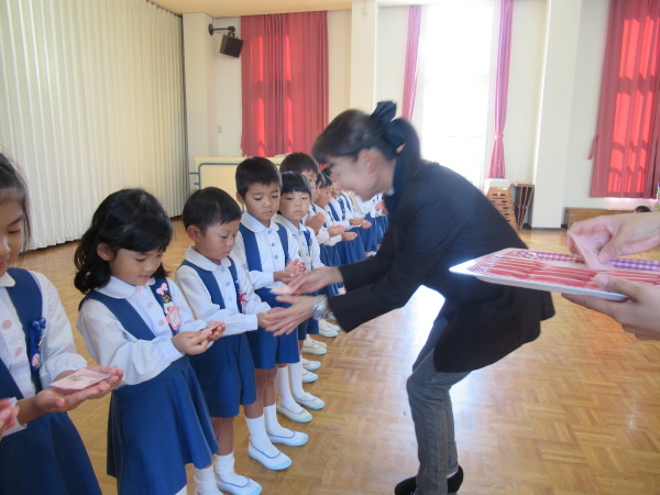 グラウンドに勢ぞろいし、園長先生から「よく頑張ったね!」のしるしとして、各クラスの代表の子どもたちがプレゼントをいただきました。