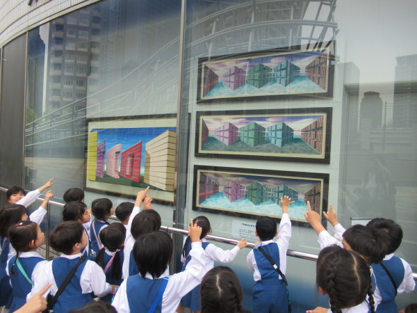 科学館に着いて集合写真を撮った後、科学館の周りにある「不思議な絵」に興味津々の子どもたち!