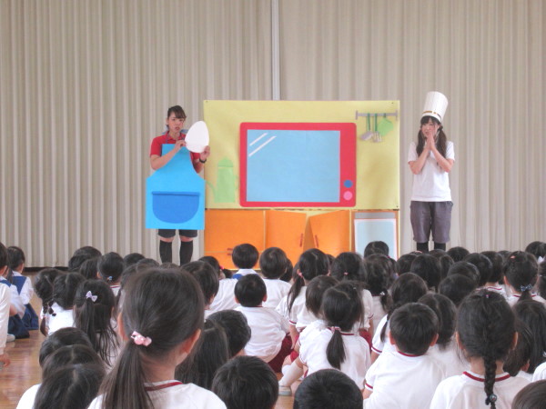 続いて、笑顔で過ごす子どもたちが、幼稚園で歌っている歌や手遊び、ダンス、絵本などの紹介をしました。
