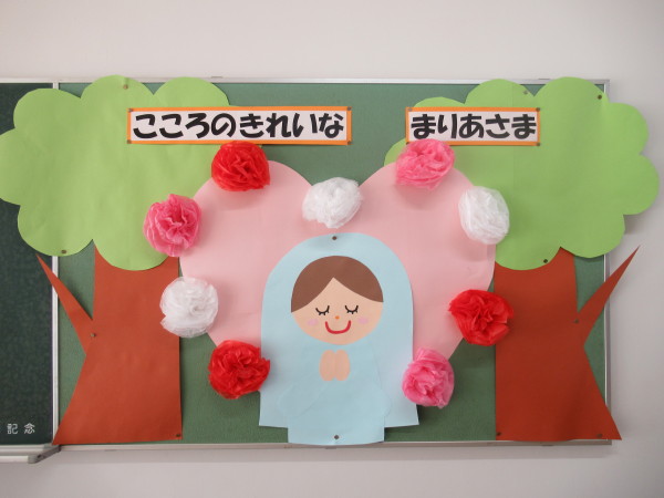 今日の日を迎えるために、子どもたち一人ひとりが自分の心の中に花を咲かせる「徳の花」に取り組んできました。子どもたちみんなが、いつでも優しい心で一日一日を大切に過ごす事が出来るように、中央ホールにもマリア様を飾り準備をしてきました。