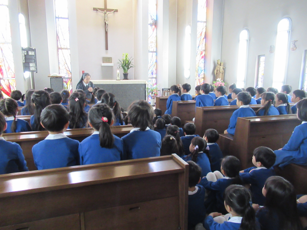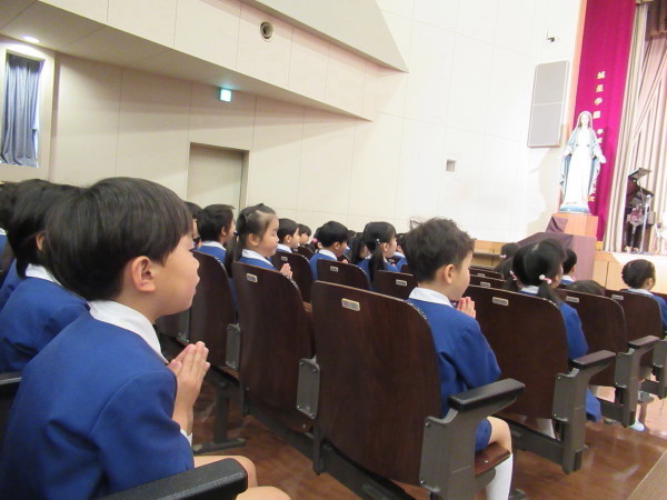 「ひとつ大きくなって年中組、年長組になりました。今日から始まるこれからの一年間、たくさんのお恵みがありますように…」と心をあわせて、お祈りをお捧げしました。