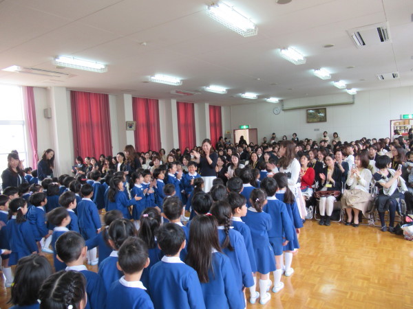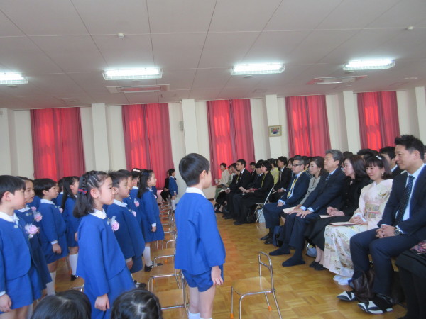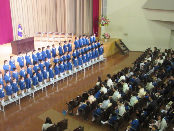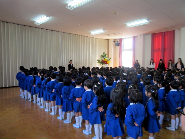 講堂には、お祝いに来てくれた年長組さんが待っていて、みんなが揃うと一緒に聖歌を歌い、入園式が始まりました。