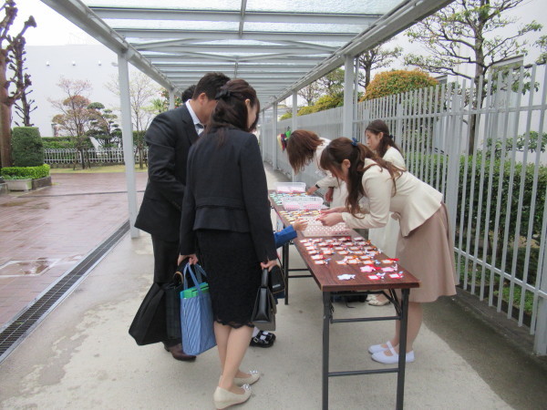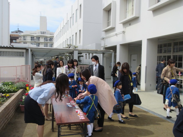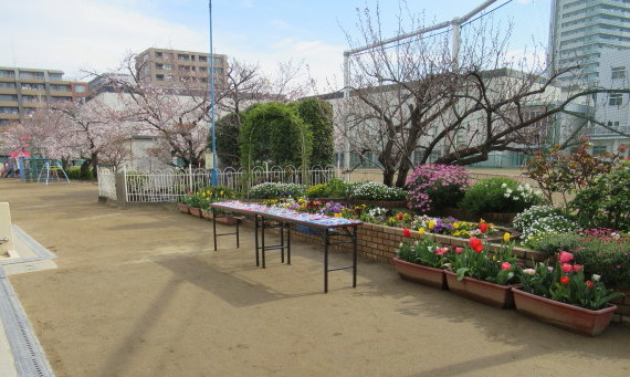 昨年の年長組が植えたチューリップの花がきれいに咲き、寒の戻りの影響で、園庭の桜の花も七分咲き。幼稚園のたくさんの花が、お家の人と一緒に登園してくる子どもたちを迎えていました。