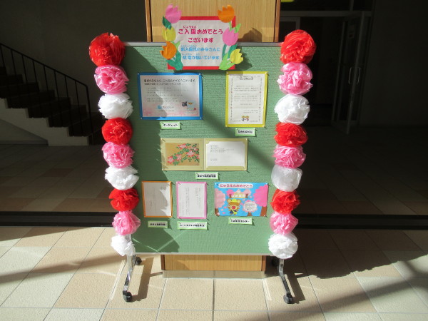 正門でマリア様がみんなの事をお迎えし、マリア様の後ろや、おみどうの側では、キリンさんやクマさんが「にゅうえん おめでとう!」とお迎えをしていました。
