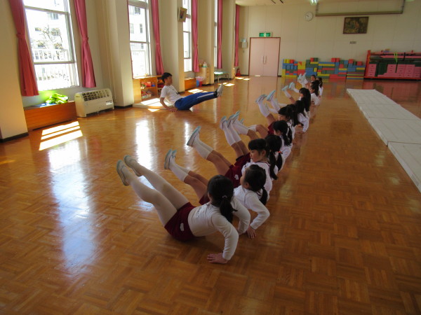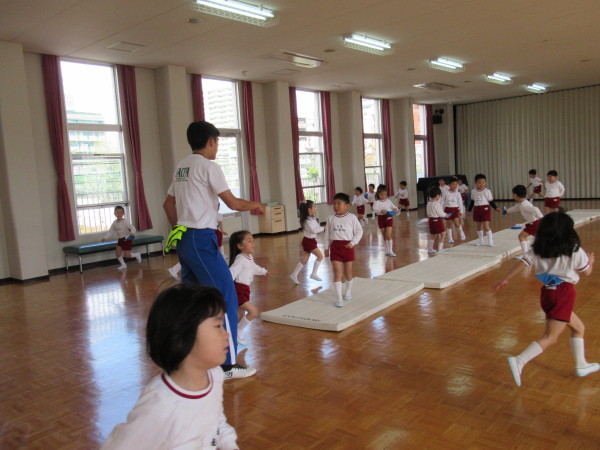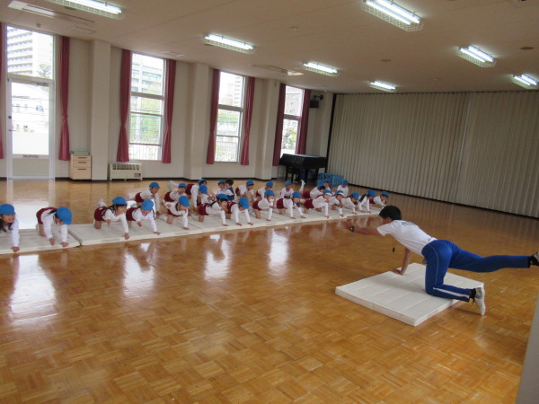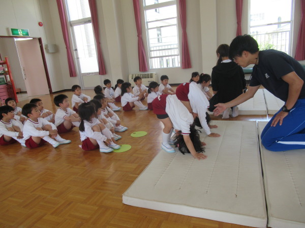 その後は、マット運動です。お尻を高く上げ、手でマットを押す “くまのポーズ”で進みます。そこから、前転の指導へとつながっていきました。