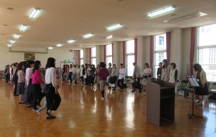保護者の方々も拍に合わせ、横の列を合わせて前進したり、止まったり、“まわれ右!”をしたり… 8拍を数えながら、真剣な様子で取り組んでくださいました。