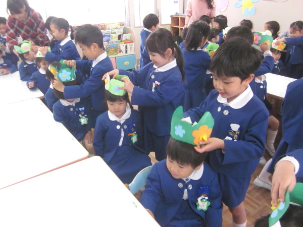 年長組が作ったお花の冠をもらい、手を繋いで遊戯室に行きました。