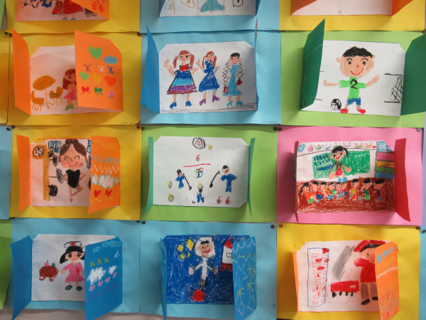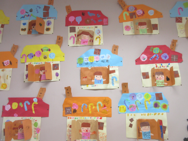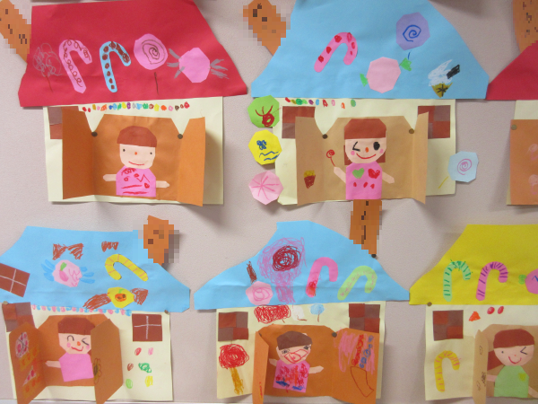 大きな画用紙を使ってお家を作り、キャンディーやチョコレート、ステッキなどのお菓子をたくさん飾って、クレパスで好きなお菓子を足し絵しました!!