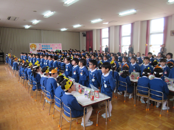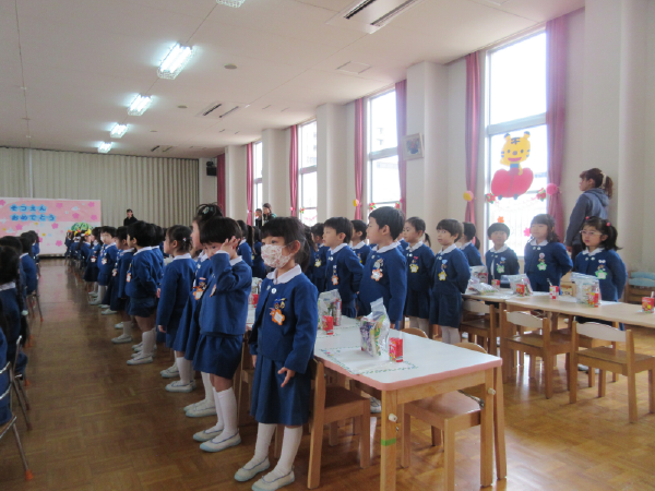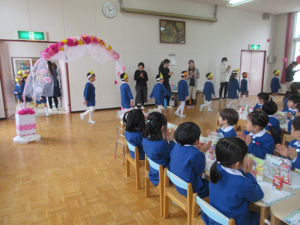 今日は、いつも遊んでくれたり、手伝ってくれたやさしい年長組さんに、「ありがとう!」の気持ちを込めてお別れ会を行いました♪