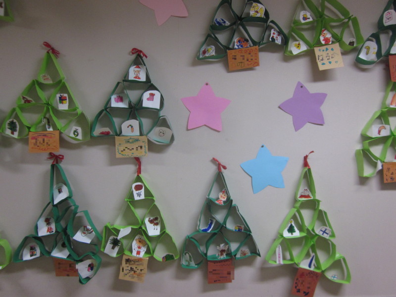 大きなクリスマスツリーには、金色の折り紙や色々な飾りを貼って、みんなで飾り付けをしました!!