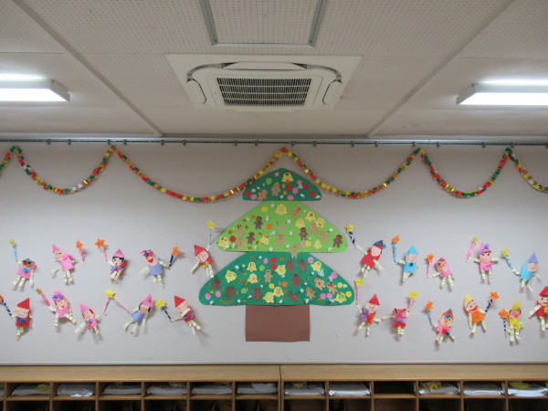 年少組の12月の壁面では『小人人形とクリスマスツリー』を制作しました♪♪