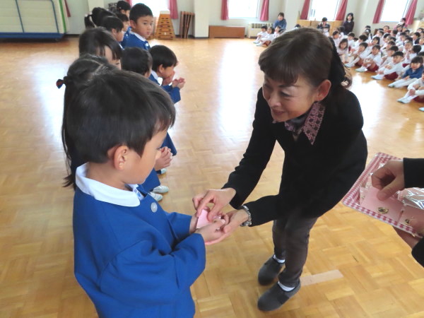 次に、年中組さんと年少組さんからカードとプレゼントを渡しました!