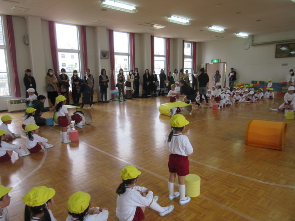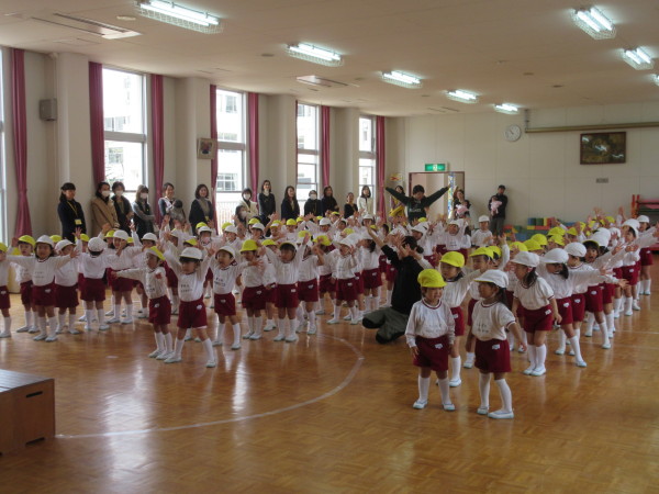 遊戯室に全園児が集まり、歓迎会が始まりました。