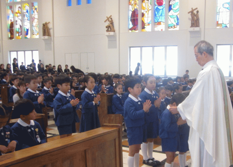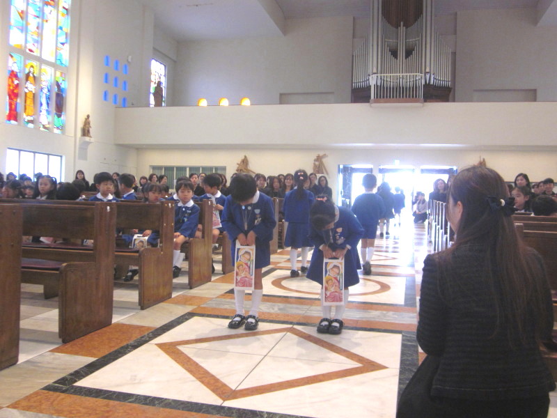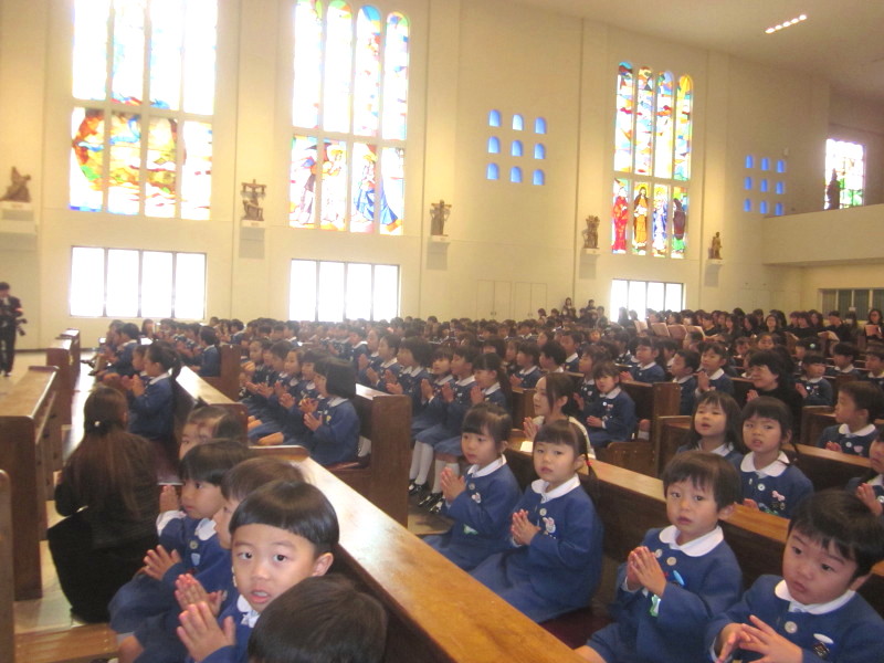 大聖堂に、子どもたちと年長組の保護者の方が集い、一人一人の成長を喜び、そして、今まで見守ってくださった神様に、感謝の気持ちを込めてお祈りをお捧げしました。
