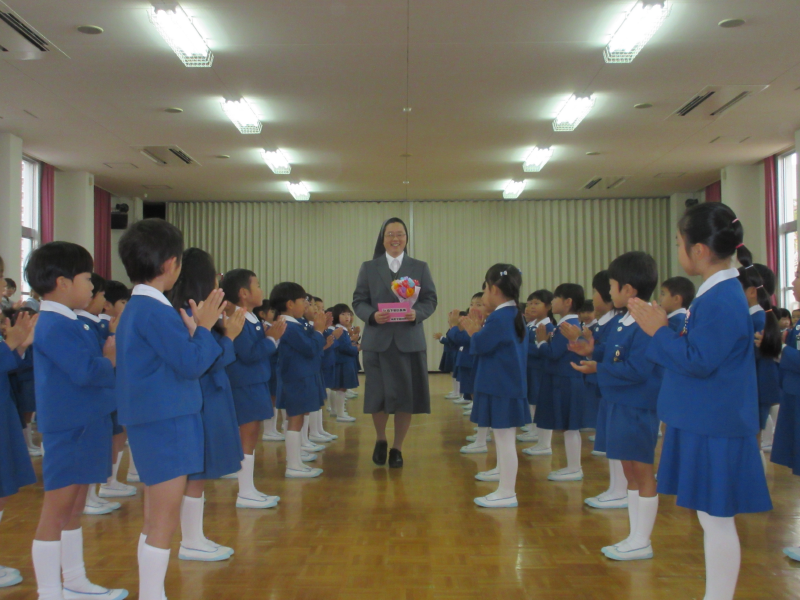 年長組の子どもたちが作る花道を通っていく森下シスターを、拍手でお見送りしました。