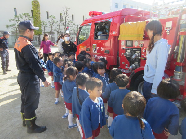 今日は消防士の方が幼稚園に来てくれました♪赤い車の消防車に興味津々・・・・・
