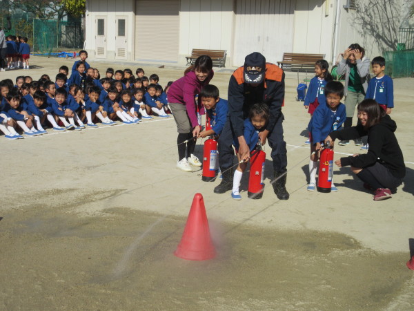 年長さんは実際に訓練用の消火器を使わせてもらいました♪