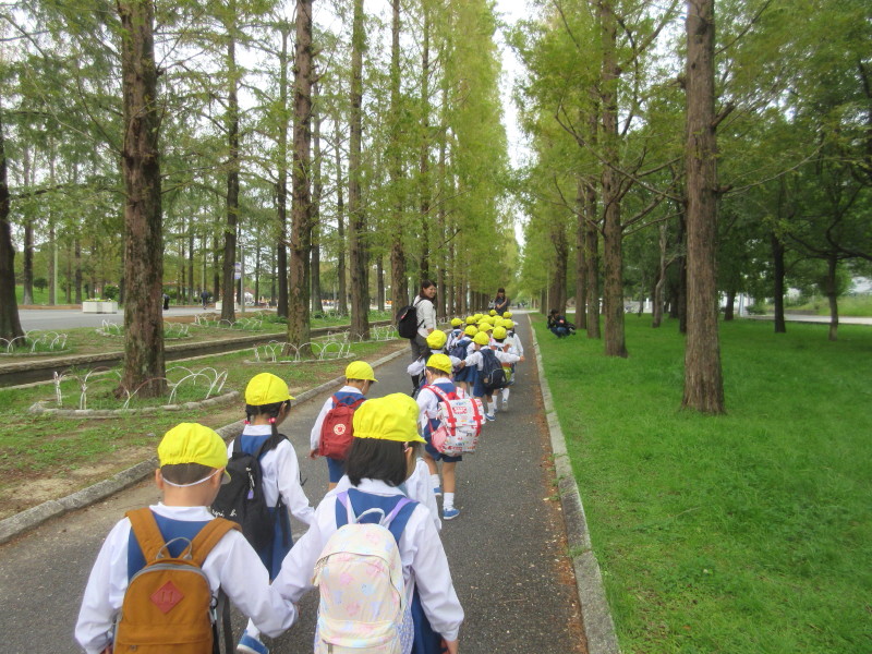 鶴見緑地公園に到着です!たくさんの木が並んでいる間を、歌を歌ったり、お友達とお話しをしたりしながらてくてく歩きます!