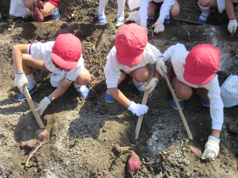 はじめは固い土に戸惑っていた子ども達ですが、土からさつまいもの姿が見えるたびに、笑顔があふれ出し、元気いっぱいに一生懸命掘っていました(^^)さつまいもが抜けた時には「やったー!!先生、取れた!!」と子どもたちも大盛り上がりでした♪