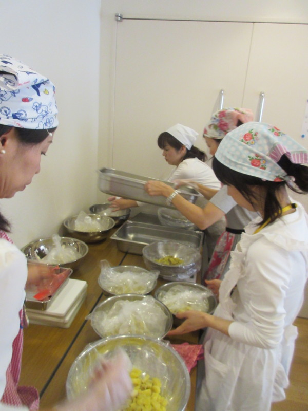 朝、クラスのお母様方が剥いて、切ってくださったサツマイモを給食室で蒸してもらいました。
