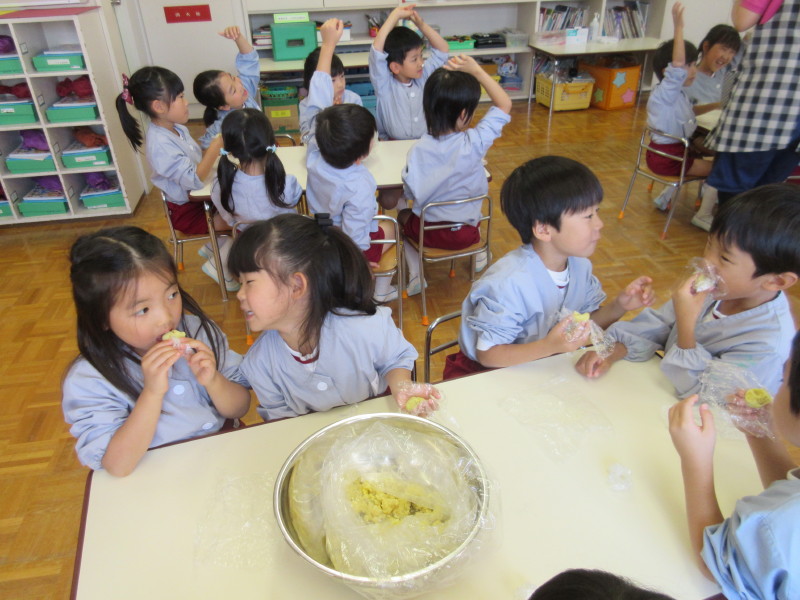友だちと作って食べる芋きんとんは、とっても美味しかったようで「おかわりー!」とたくさんの声が聞こえてきました(^^)