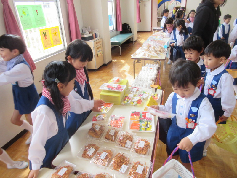 スーパーマーケットでは「やさい」「くだもの」「さかな」「おにく」「のみもの」「おかし」「あいす」「おそうざい」「おすし」などなど品揃えも豊富で、みんな何を買おうか迷いながらもお買い物を楽しみました♪