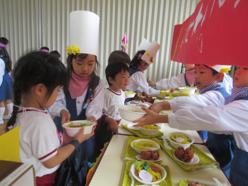 レストランコーナーでは『おこさまランチ』をお客さんの要望を聞きながらお皿に盛り付け、「はい、どうぞ〜!」と渡します♪
