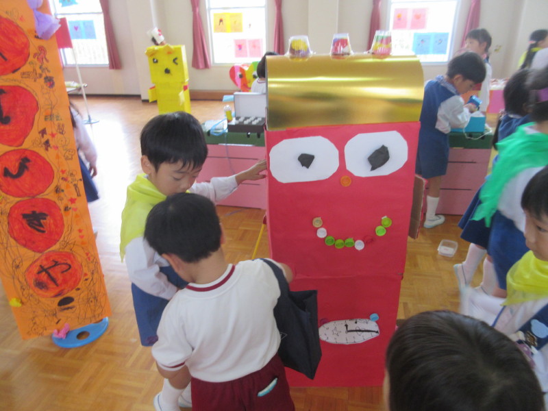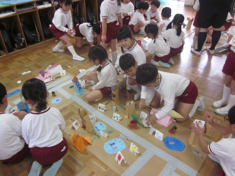 各クラスの個性が出た作品が出来上がり、最後は皆でペープサートを使って、お友達の村にもお出かけしました♪