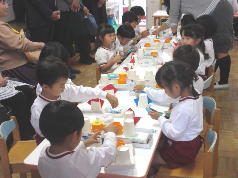 年中組は紙制作[どんぐり村」を作りました。昨日、どんぐり村の絵本を読み、ペープサートを作りながら「明日はお花屋さんを作る!」「大きなお家を建てる」と楽しみにしていた子ども達。今日は、お店屋さんや、動物園、池、公園など様々な物を作っていました☆