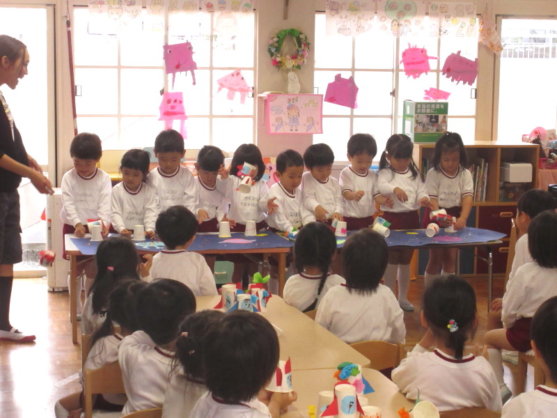 年少組では、紙コップと輪ゴムを使った『ロケット』を作りました!お部屋に子ども達が作った宇宙人を飾って、宇宙探検に出発です!まずは、先生から作り方を聞きます。