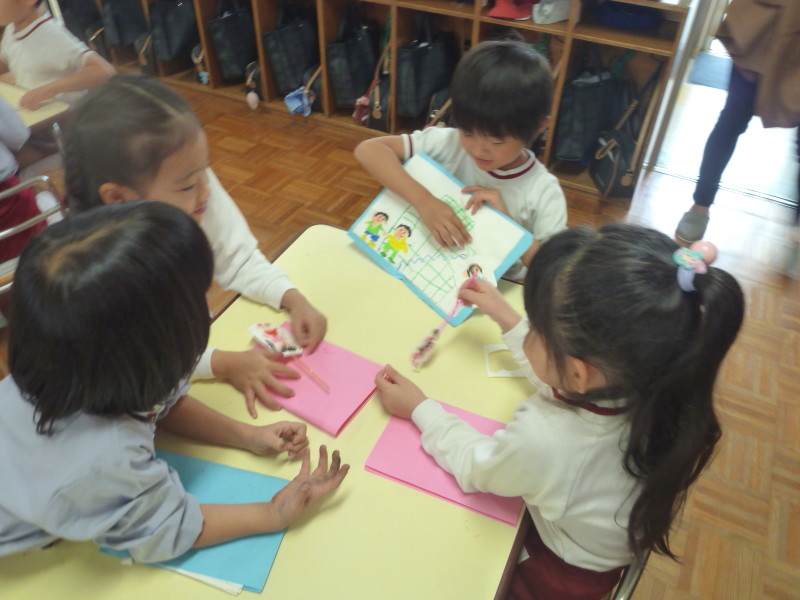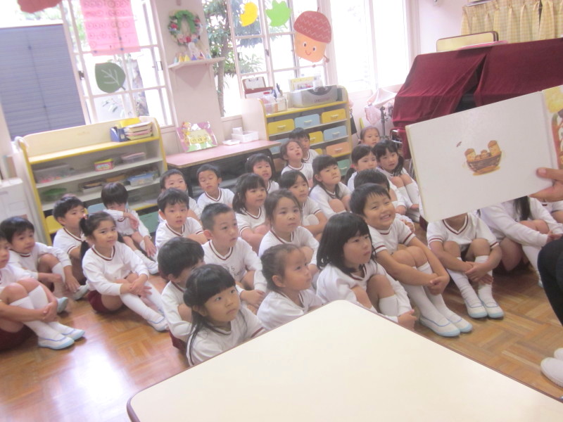 部屋に戻ると、絵本タイムです。それぞれ『どんぐりむらの 〜〜やさん』の絵本を読み、明日に期待を持ちながら、ペープサート”どんぐり”を作りました。