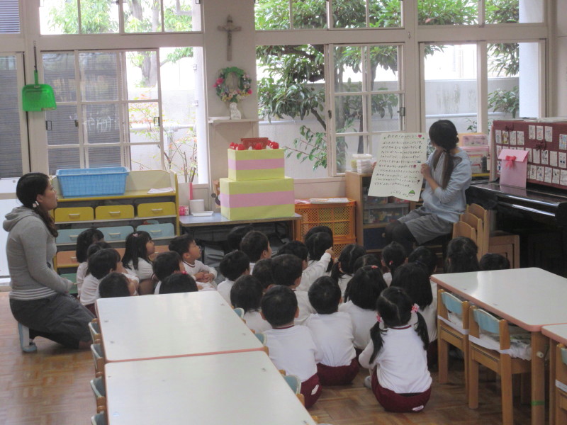 10月生まれの子どもたちは前に並び、お友達や先生から歌とお言葉のプレゼントをもらいました☆