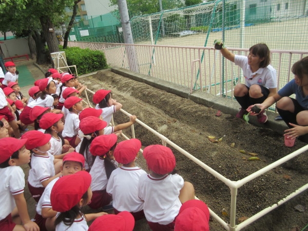 自分たちで小さな穴に苗や種を植えて、野菜のベッドを作ります!!