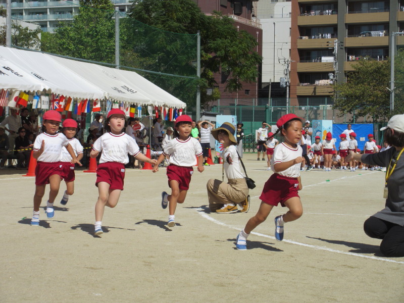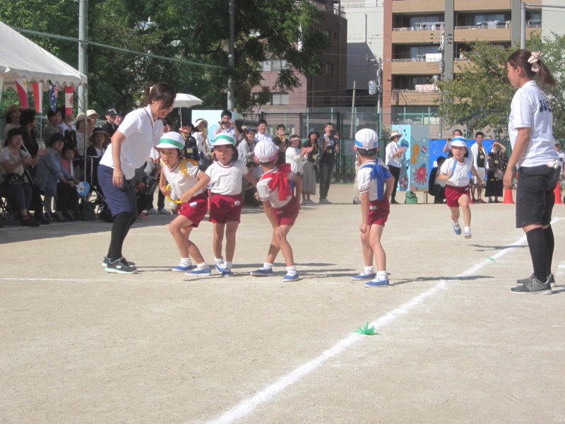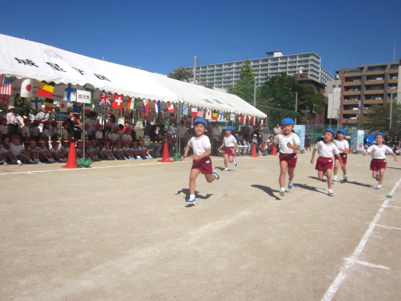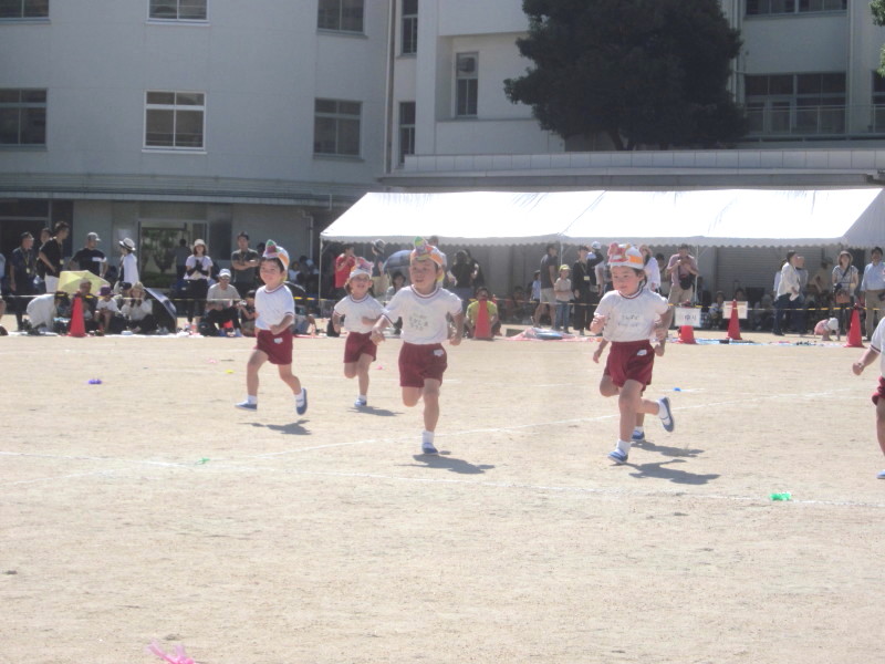 「ドキドキする〜」「負けないぞ!」と笑顔の子ども達でしたが、“よ〜い、ピッ”の合図と共に真剣な表情に変わり、一生懸命走っていました(^^)