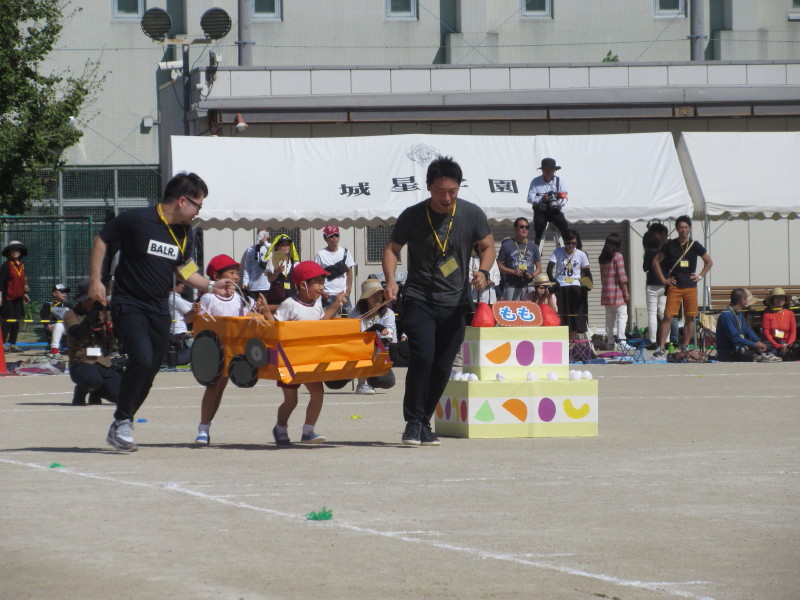 はじめは少しドキドキしていた子どもたちでしたが、「よーいどん」の掛け声で、おもちゃに変身した子どもたちがゴールに向かって元気に走ることができました!