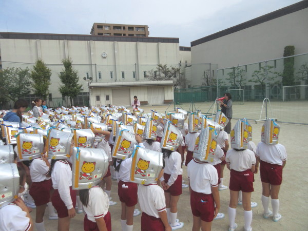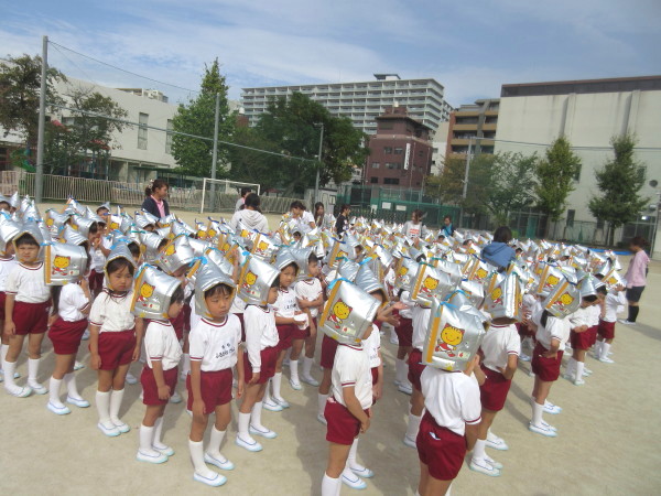 初めて年少組が防災頭巾を被っての訓練となりましたが、