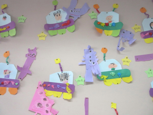 宇宙人は、画用紙を手でビリビリビリ〜!!と破りながら、好きな大きさ、形にしたものを張り合わせて作りました(^^)